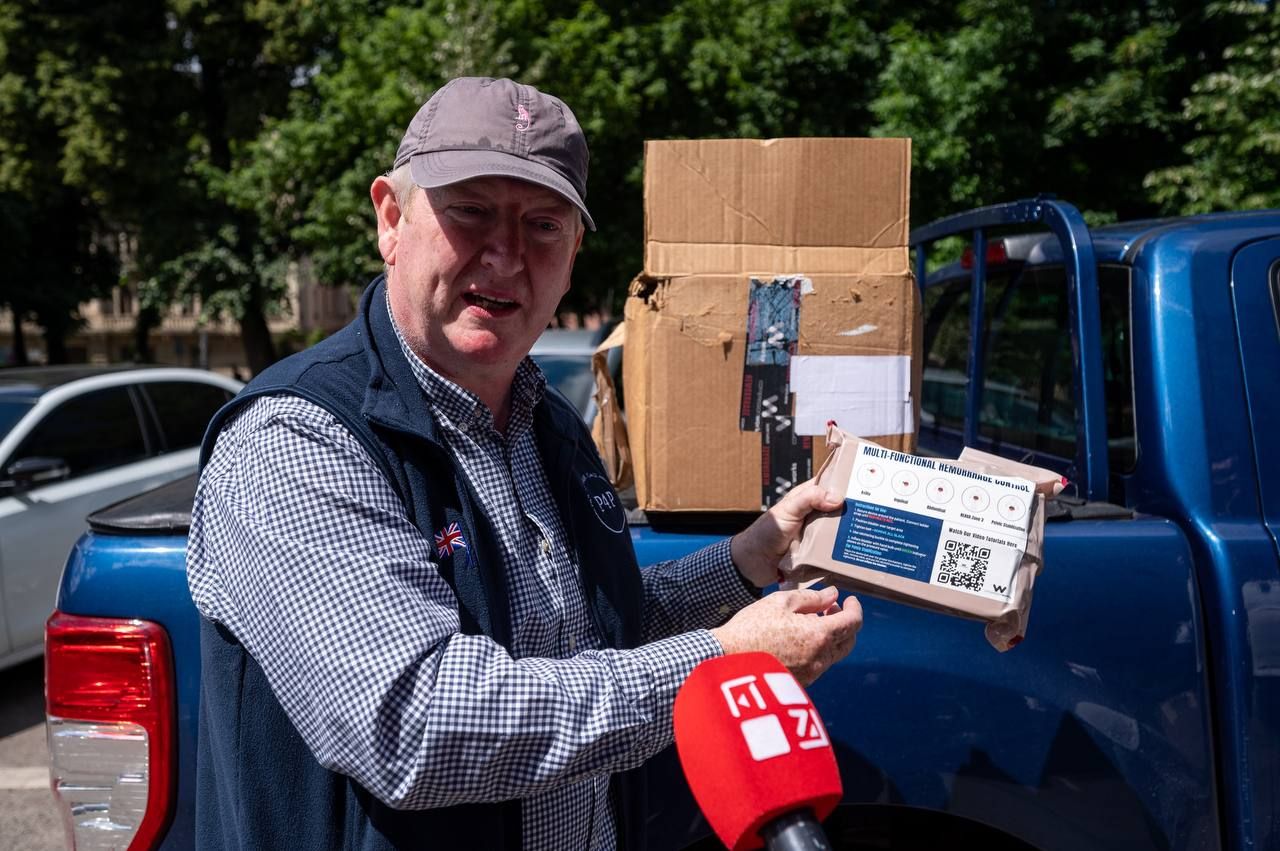 - “Ці турнікети використовують для великих поранень на тілі. Вони коштують майже 20 тисяч гривень кожен. Ми передаємо 70 таких. Крім того, передаємо звичайні турнікети, шприци та інші цінні медичні речі. Ми цікавились у медиків з передової, що їм потрібно і що важко отримати, ці речі були на першому місці в списку. Це дуже маленькі, але дуже цінні речі, і наступного разу ми закупимо їх у більшій кількості”, – зазначив учасник акції Аластер Стюарт.