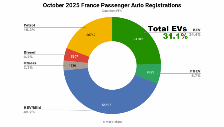 У жовтні частка електромобілів у Франції досягла 31,1%, що на 7,6% більше, ніж минулого року. Зокрема, повністю електричні авто (BEV) збільшили свою частку до 24,4%, а гібридні (PHEV) становлять 6,7% від загального обсягу.