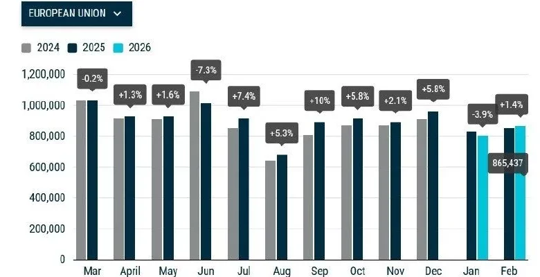 Європейський ринок нових легкових автомобілів у лютому 2026 року продемонстрував помірне зростання: 865 437 одиниць зареєстровано в країнах ЄС, що на 1,4% більше, ніж у лютому 2025 року. Ключовою тенденцією стало безумовне лідерство електрифікованих силових установок — разом гібриди, плагін-гібриди та повністю електричні авто охопили 67% усіх реєстрацій, тоді як рік тому цей показник становив лише 58,5%.