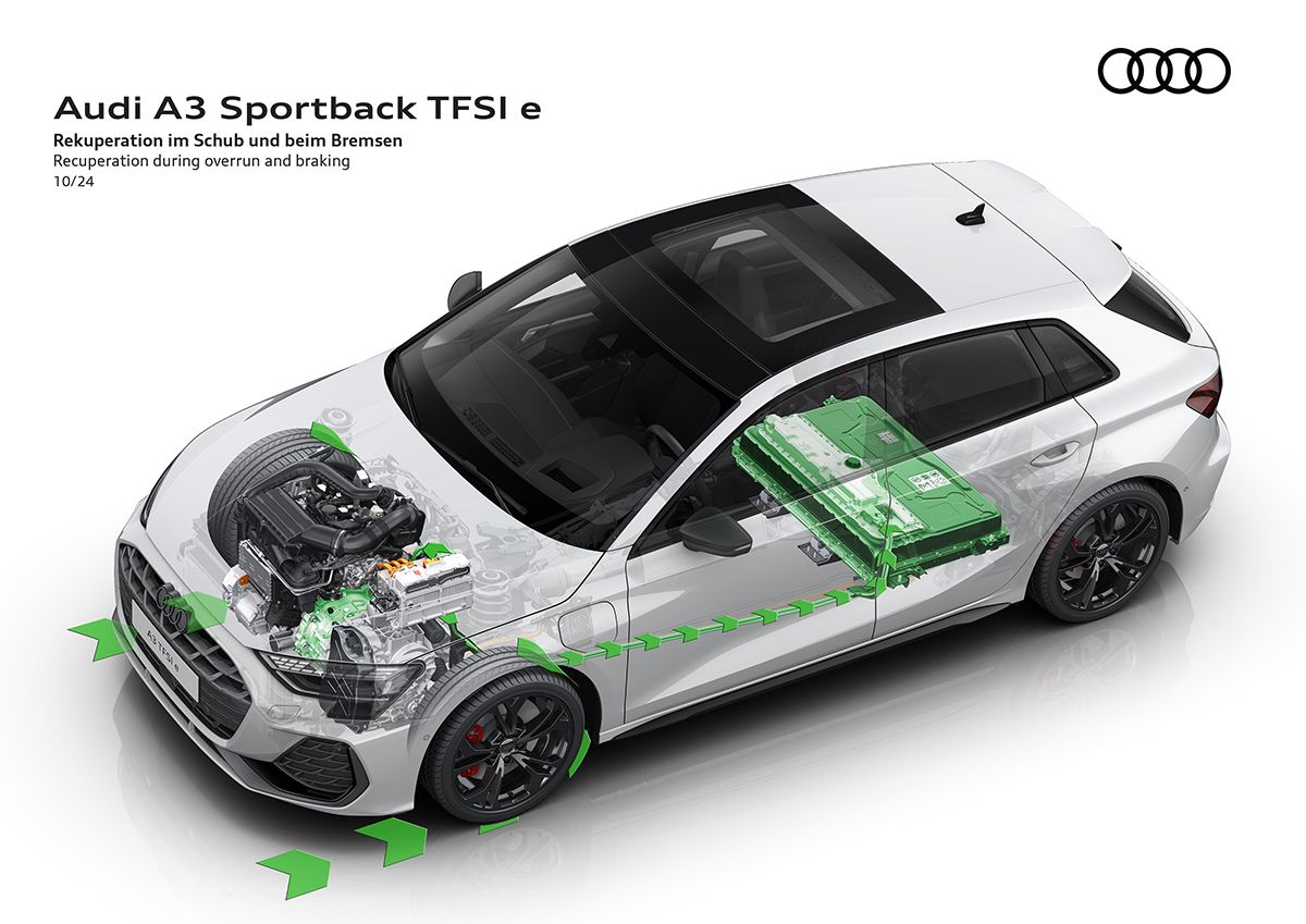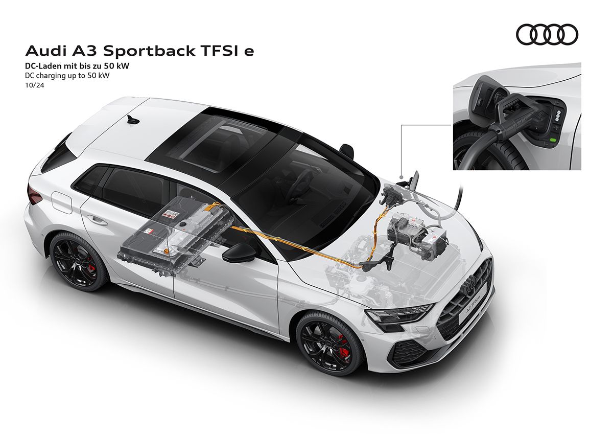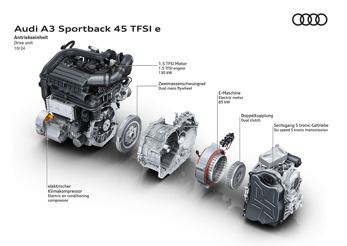 Інженери Audi надали плагін-гібриду A3 Sportback TFSI e нову батарею зі спеціальним контуром охолодження ємністю 25,7 кВт-год, яка підтримує заряд до 50 кВт, а також підвищили продуктивність двигуна. Модель оснащена 1,5-літровим двигуном TFSI evo2, що замінив 1.4 TFSI.