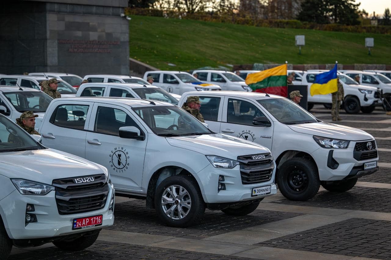 Якщо точніше, то в рамках Коаліції розмінування уряд Литви придбав і урочисто вручив Україні одним пакетом 230 пікапів та 240 міношукачів. Церемоніал вручення техніки відбувся на схилах Дніпра біля входу до Національного музею історії України у Другій світовій війні.