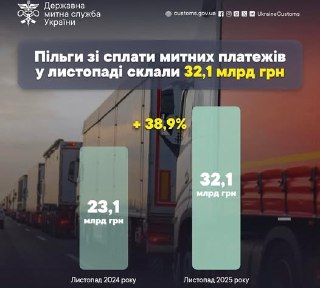 У листопаді 2024 року до українського держбюджету було спрямовано 61,9 мільярда гривень митних платежів, як повідомила Держмитслужба України. Водночас, завдяки митним пільгам, за імпорт товарів було звільнено від сплати 32,1 мільярда гривень, що становить 51,9% від загальної суми доходів у казну.