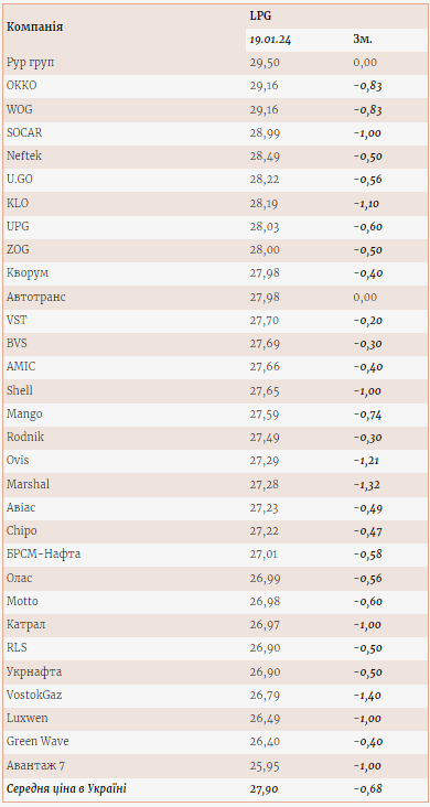На станціях «Укрнафти» і UPG ціна зменшилась на 0,50 грн/л і 0,60 грн/л, до 26,90 грн/л і 28,03 грн/л відповідно. На 56 копійок здешевшав автогаз у мережі U.GO – до 28,22 грн/л.