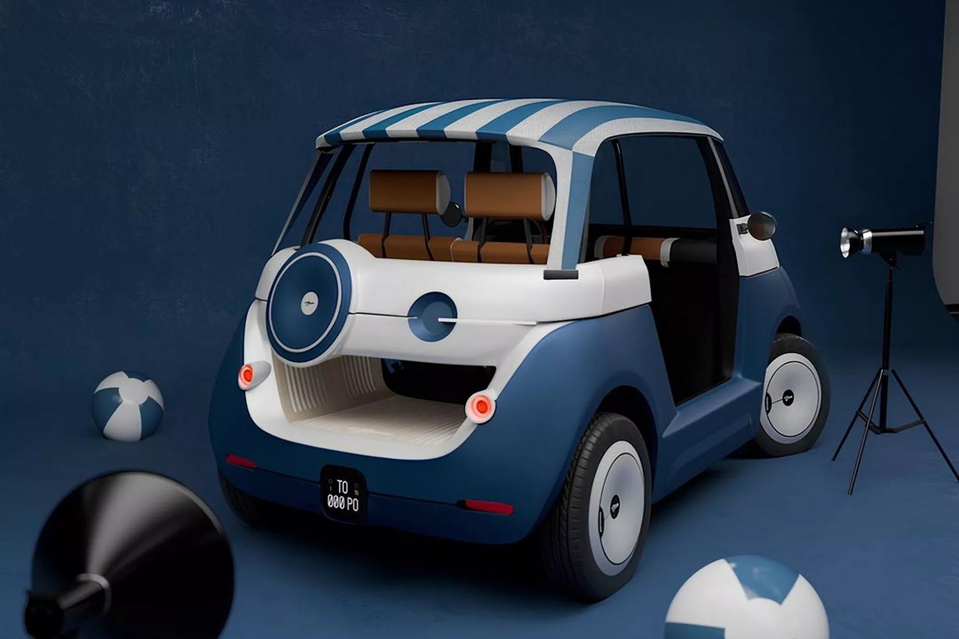 Двері в автомобіля, який за розмірами, фактично, є квадроциклом – відсутні. Задня частина створює атмосферу яхти з напіввідкритим вантажним відділенням із низькою дерев’яною підлогою й має вінтажні світлодіодні ліхтарі, брезентовий дах і круглий елемент, схожий на тримач запасного колеса.