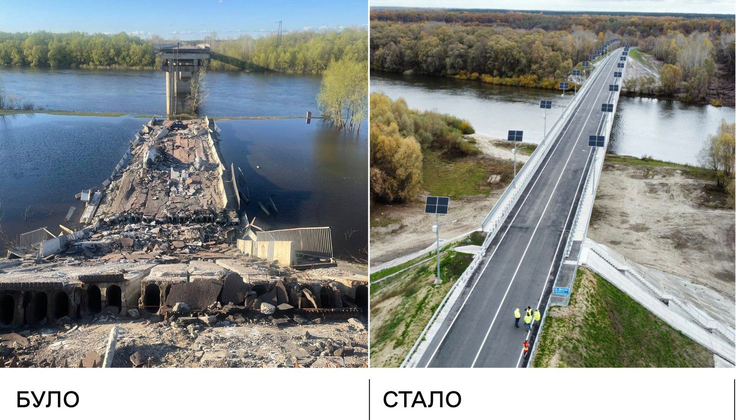 З архівних знімків зрозуміло, що ремонту частина мосту не підлягала. Тому було прийнято рішення про часткове спорудження нового мосту. Після деокупації мостобудівники розчистили річище, “відновили відсутню частину прогонової будови, а вцілілу частину мосту капітально відремонтували”.