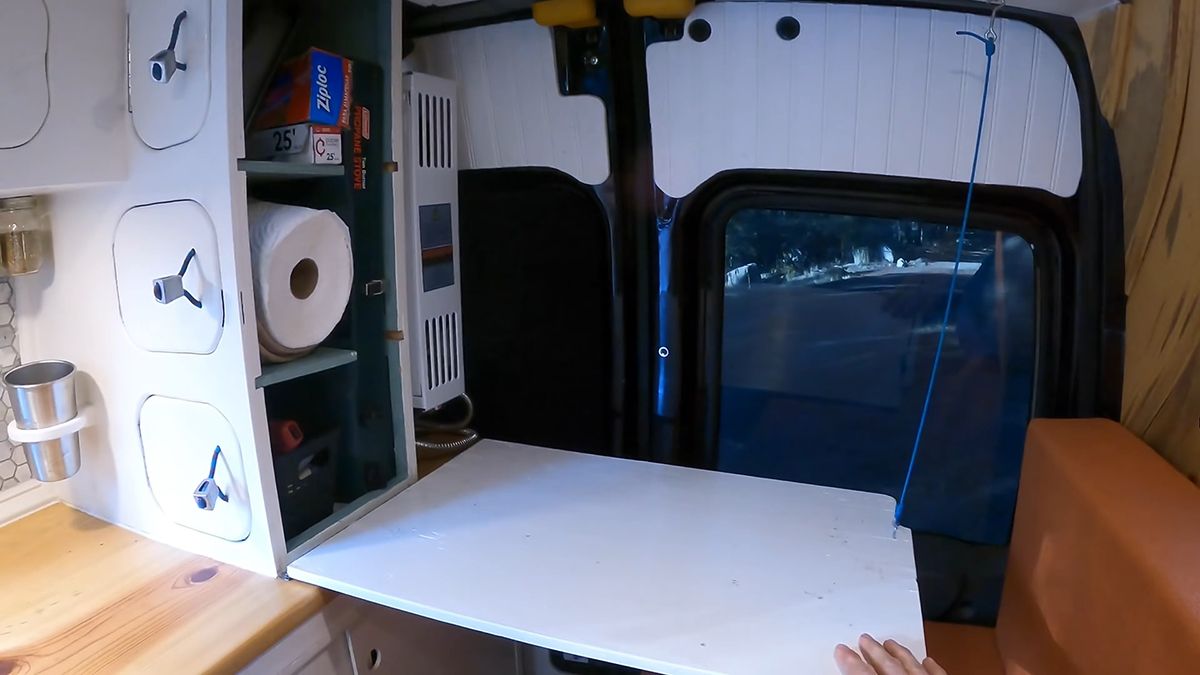 На протилежному боці можна знайти кухню, де зібрано найнеобхідніше. Вона має невелику раковину, стільницю з сосни та шафу під нею, в якій розміщена проста система водопроводу. Ба більше, для приготування їжі Остін використовує портативну піч для кемпінгу.